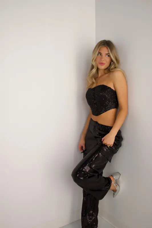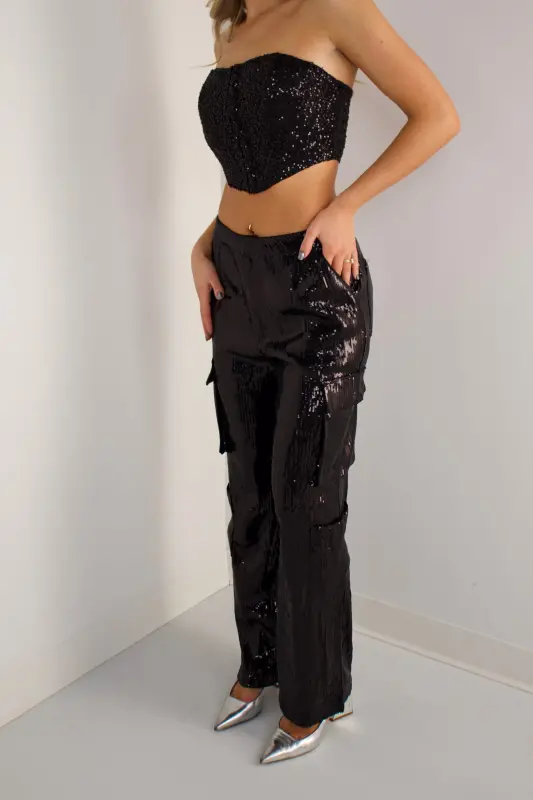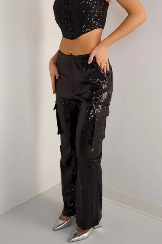 The Celeste Sequin Cargo Pants bring a high-shine twist to an edgy, street-inspired silhouette. Fully embellished in glossy black sequins, these statement pants feature a relaxed straight-leg fit with functional cargo pockets that add dimension and attitude. Designed with comfort in mind, they offer a smooth waistband, easy movement, and a flattering drape that catches the light with every step. Perfect for pairing with corset tops, sleek bodysuits, or oversized blazers, these pants deliver instant glam — ideal for holiday parties, nights out, and standout event looks.