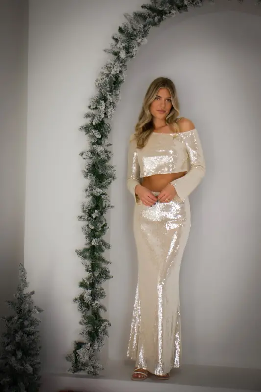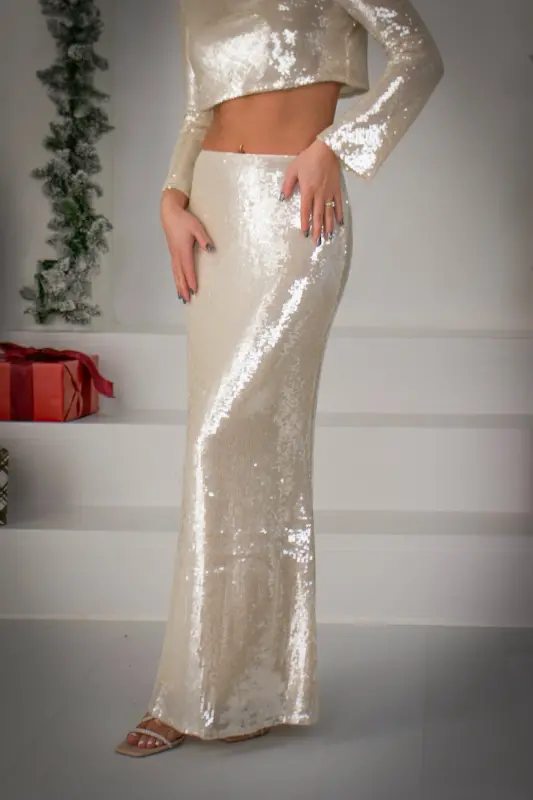 The Champagne Hour Sequin Maxi Skirt is a stunning, light-catching statement piece made for holiday celebrations and elegant winter evenings. Covered in soft, champagne-toned sequins, it creates a shimmering, fluid silhouette that moves beautifully with every step. The high-waisted fit smooths and elongates, while the hidden side zipper closure ensures a sleek, seamless look. A back slit adds comfort and graceful movement. Fully lined for a comfortable feel, this skirt pairs effortlessly with cozy knits or the Champagne Hour Sequin Long Sleeve Top for a coordinated, head-turning festive look. A glamorous must-have for parties, winter weddings, and every event that calls for a little extra shine.