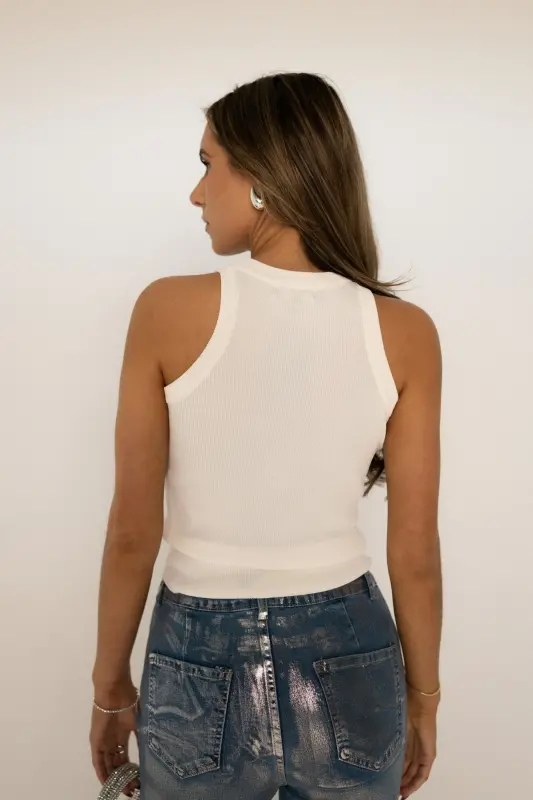 Our Classic Ribbed Tank Top In White is a closet staple and the perfect layering piece. This full length luxe ribbed tank top features a high neckline, relax fit bodice, and rounded hamline. This tank is made out of a breatable lightweight material and perfect for any time of year.