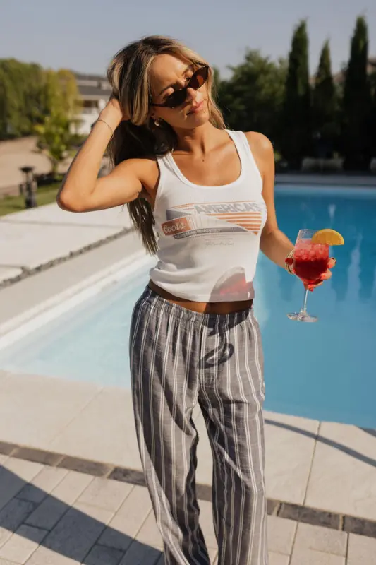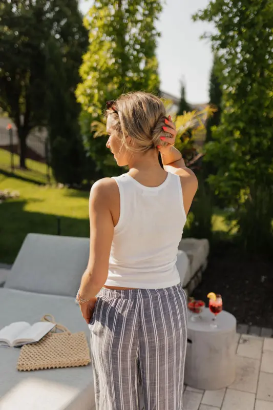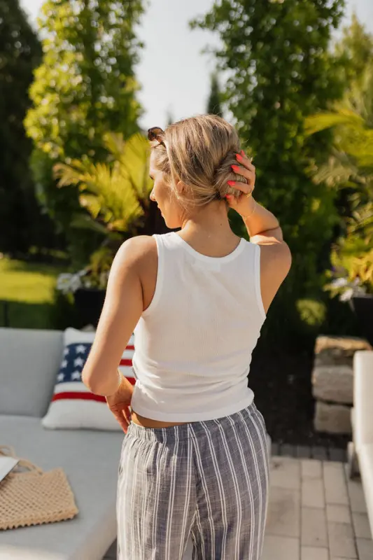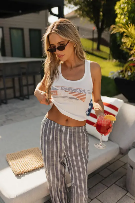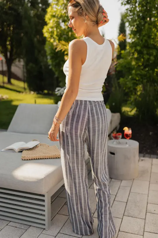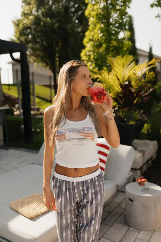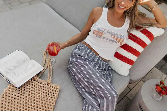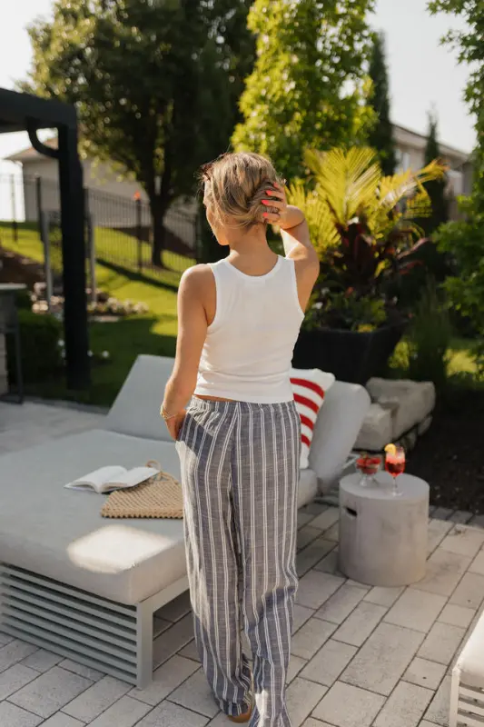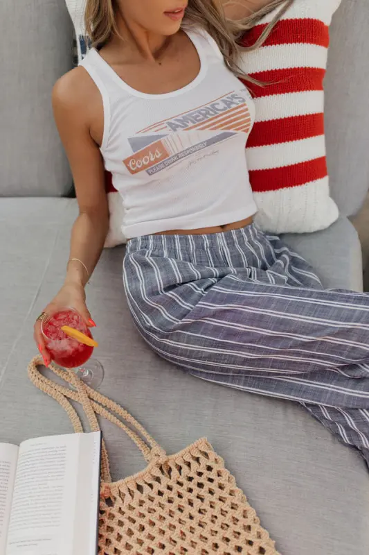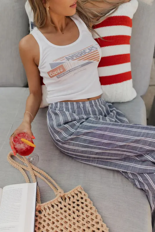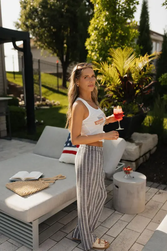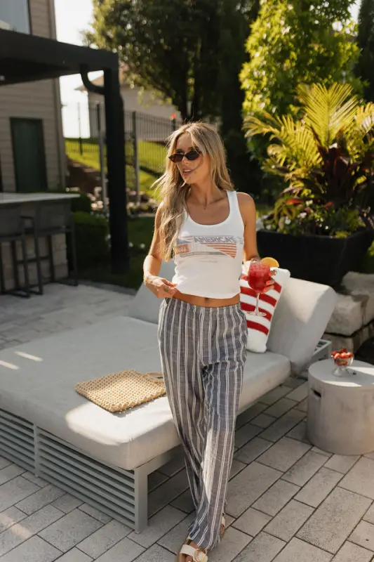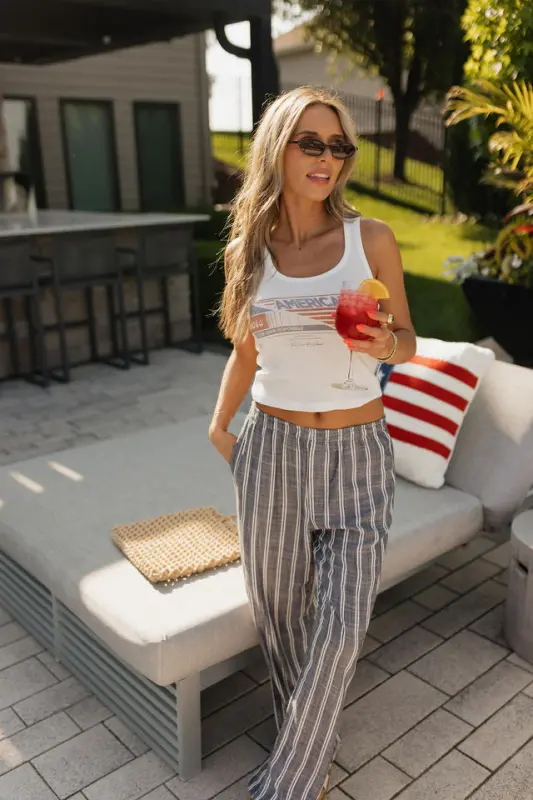 The Collins Striped Navy Slip-On Pants are a timeless summer staple that blends comfort with vintage-inspired style. Designed with a classic navy and white stripe, these lightweight slip-on pants feature an elastic waistband for an effortless fit and functional hidden side pockets for everyday ease. Made from breathable material, the Collins pants are perfect for warm-weather days, offering a relaxed yet polished mis-waist look that’s both comfortable and stylish—ideal for beach strolls, casual outings, or USA-inspired ensembles.
