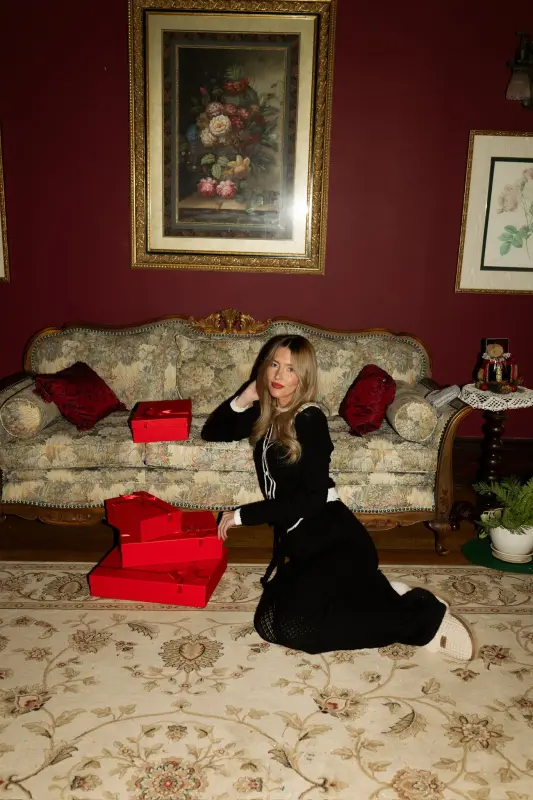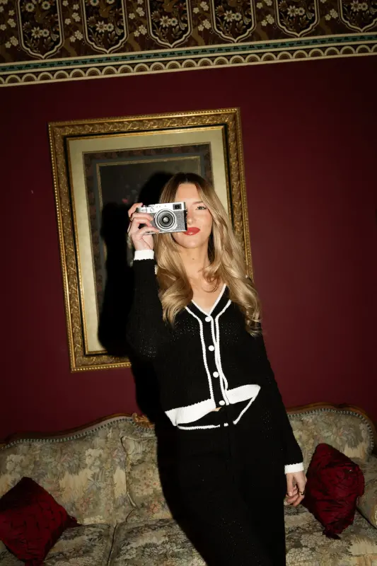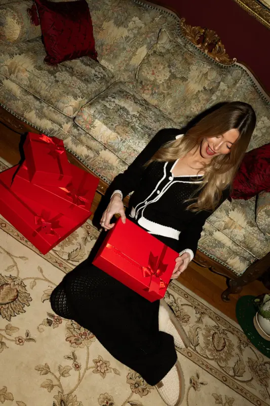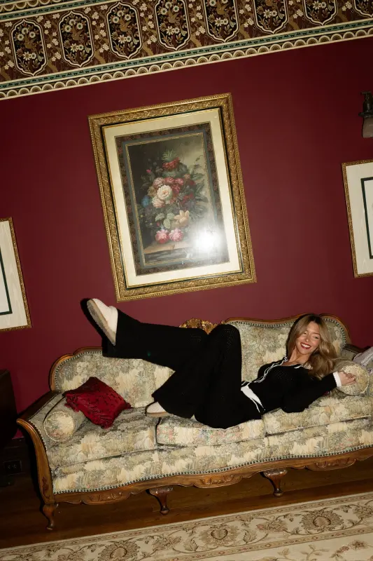 Black knit pants with cream contrast waistband. Features adjustable drawstring and soft, comfortable fabric.