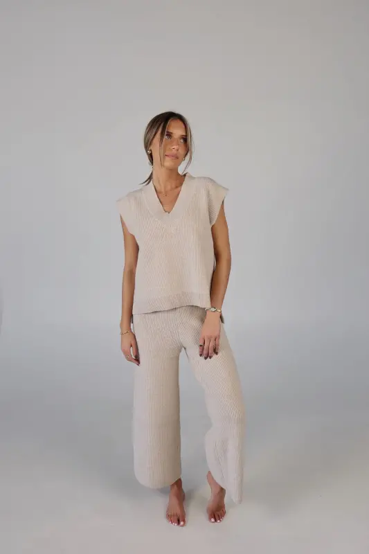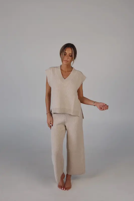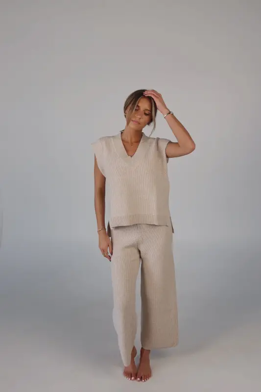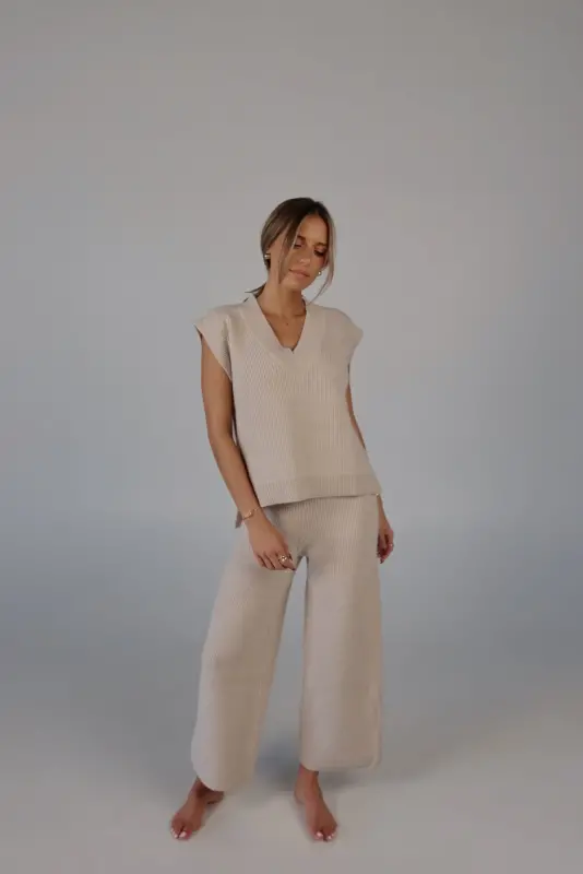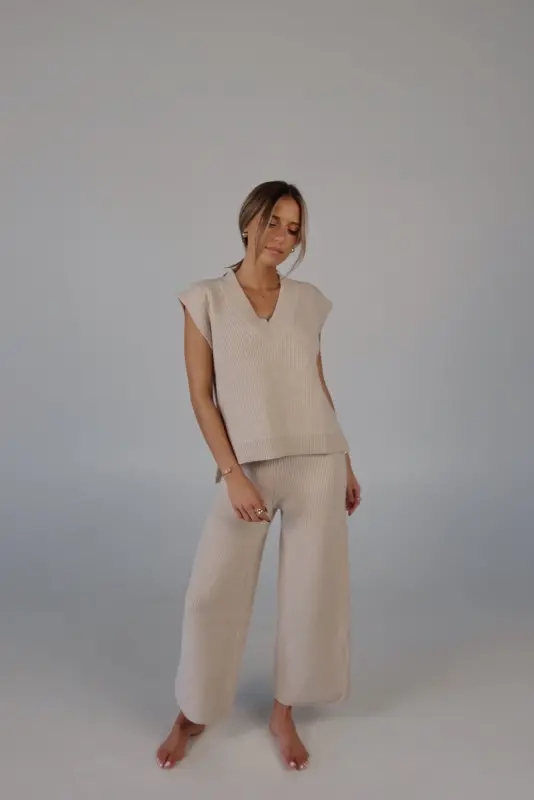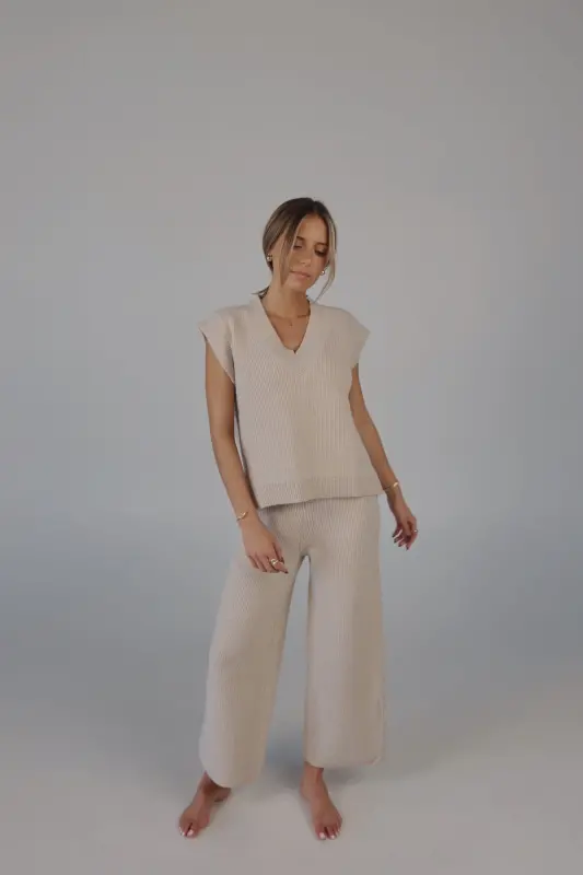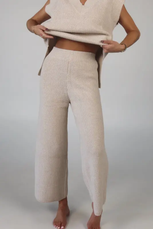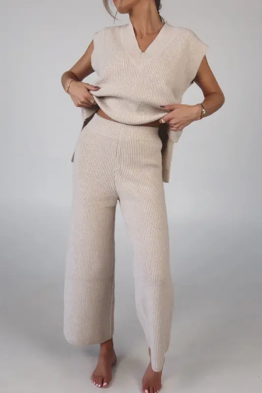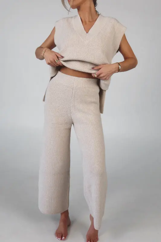 Stay effortlessly stylish and comfortable with the Cozy Knit Sweater Pants. Designed with a relaxed mid-rise fit, these slip-on pants feature a soft elastic waistband for a perfect fit that moves with you. Made from plush sweater fabric, they offer a luxurious feel while providing all-day comfort. Pair them with the Cloud Soft V-Neck Sweater Vest for a chic, coordinated lounge look that’s perfect for casual days, cozy nights, or running errands in style. These pants will quickly become your go-to for both comfort and elegance.