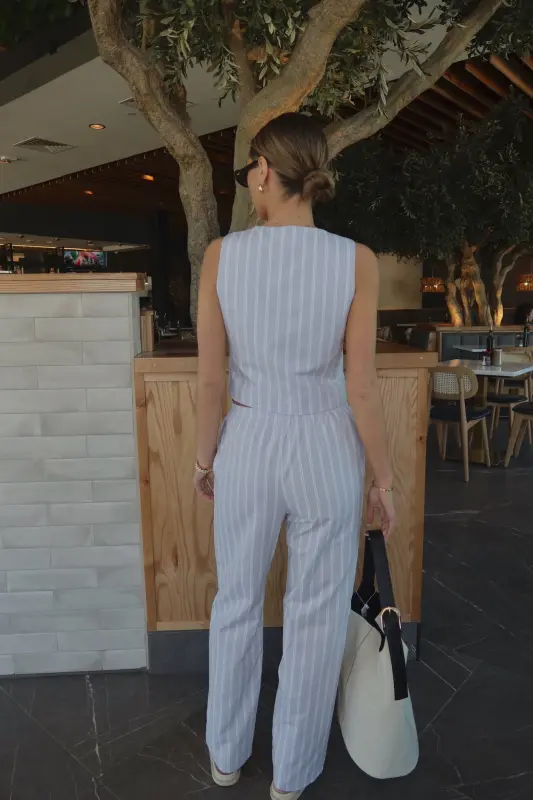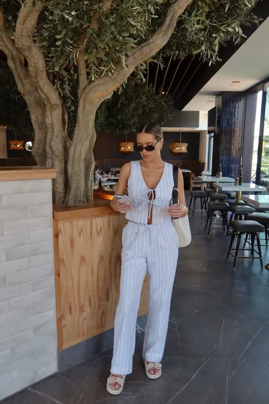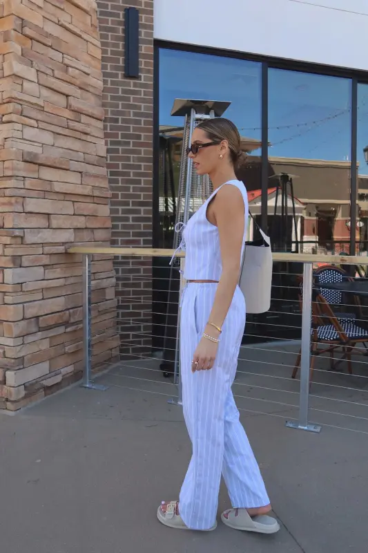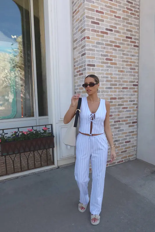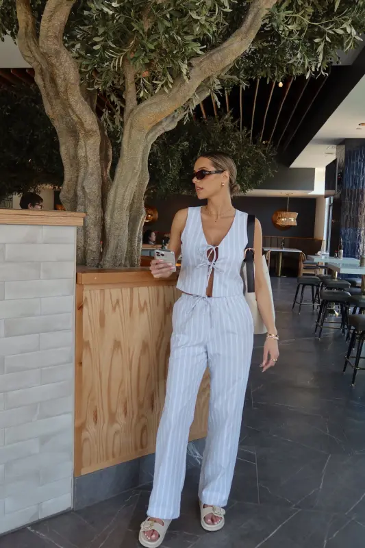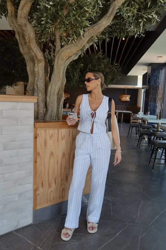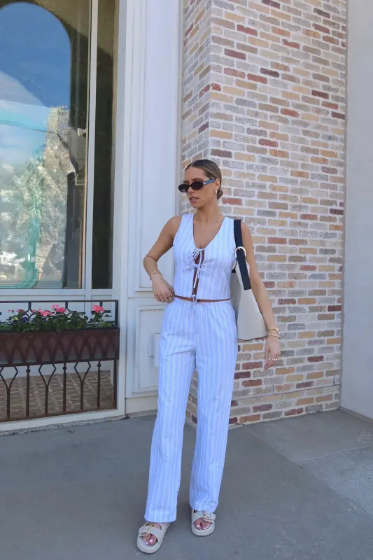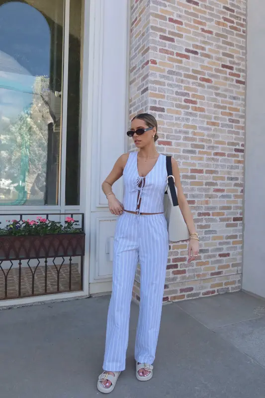 Breezy and effortlessly chic, the Della Dusty Blue Striped Tie Top is a timeless warm-weather staple. Designed with a soft baby blue base, crisp white vertical stripes, and subtle black stitched detailing, this double-lined crop top features a plunging V-neckline and adjustable double front ties for a customizable fit. Its flattering silhouette pairs perfectly with a white mini skirt, relaxed linen pants, or styled as a set with our matching Della Dusty Blue Striped Pant. Lightweight and versatile, it's a spring essential made for everything from beach days to brunch dates.