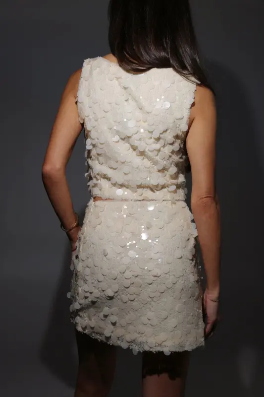 Elevate your bridal wardrobe with our Melanie Nude Sequin Set, designed to add just the right amount of sparkle to your special day. This stunning ensemble features a cropped tank top with a relaxed fit and a flattering round neckline, beautifully complemented by contrasting mesh detailing that adds a modern touch. The mini skirt showcases an elastic high waistline for comfort and style, while the varying sizes of sequins create a mesmerizing dimension that catches the light from every angle. Perfect for bridal parties, receptions, or any celebration, the Melanie Nude Sequin Set is a must-have for the chic and radiant bride. Shine bright as you create unforgettable memories in this dazzling outfit!