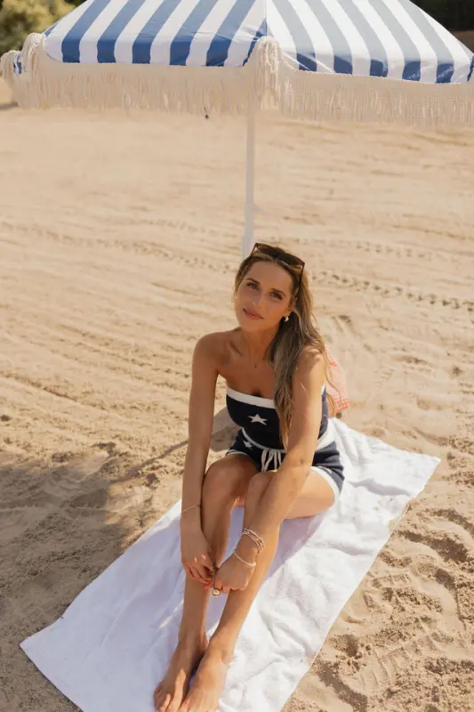 The Paige Star Knit Set is a vintage-inspired, coastal-chic matching set made for standout summer style. Featuring a navy and cream color palette, this strapless knit duo includes a mid-length crop top with a straight neckline and elastic trim, paired with matching elastic waistband shorts with a functional drawstring. Cream knit star detailing adds a playful patriotic touch, while the stretchy, breathable fabric ensures all-day comfort. Perfect for beach getaways, backyard barbecues, or your Fourth of July celebration, the Paige Set brings effortless charm to any USA-inspired look.