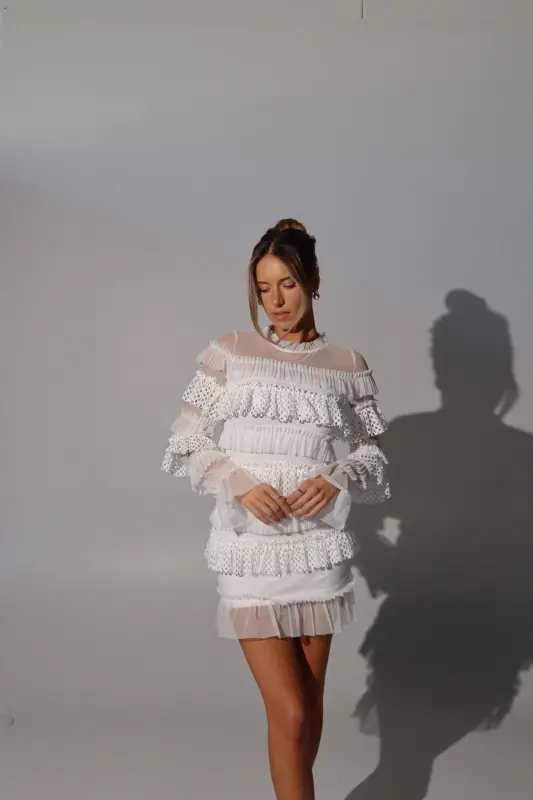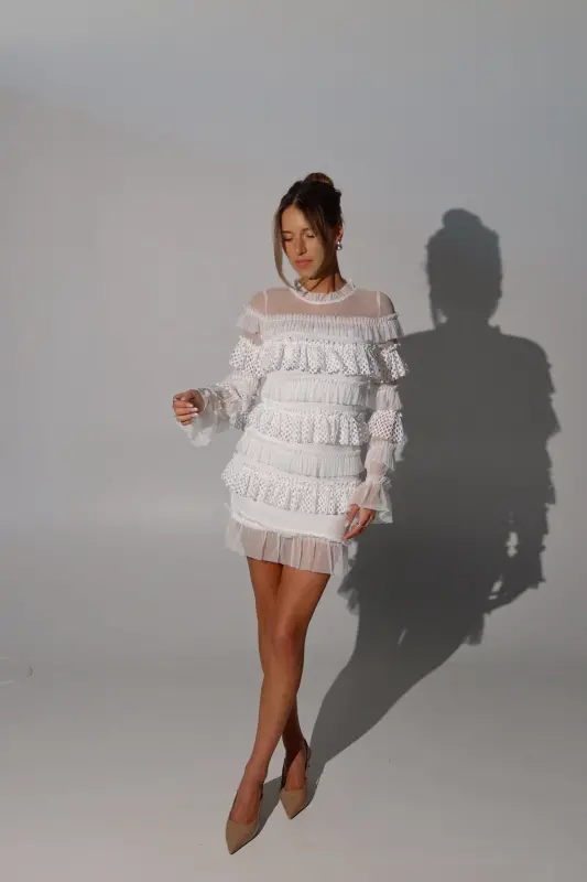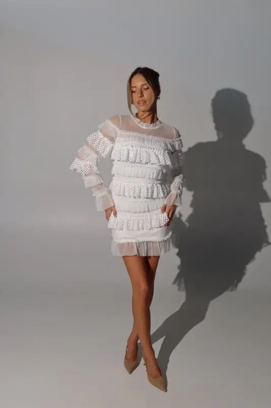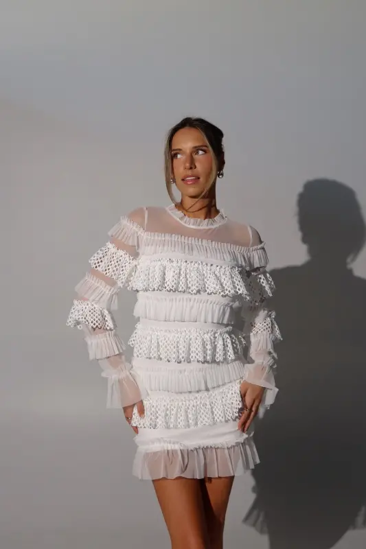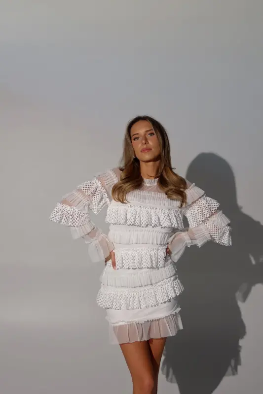 Step out in style with our Taryn Tiered Mini Dress, a perfect blend of sophistication and playfulness. This chic dress features long sleeves and a fully lined fitted bodice, ensuring both comfort and elegance. The standout three-dimensional textured ruffle details throughout add a unique and eye-catching flair, making this dress a true showstopper. Versatile enough for any occasion—whether it’s a brunch date, evening gathering, or special celebration—the Taryn Mini Dress adapts beautifully to your wardrobe. Elevate your look with this classy piece that promises to make you feel confident and fabulous wherever you go!